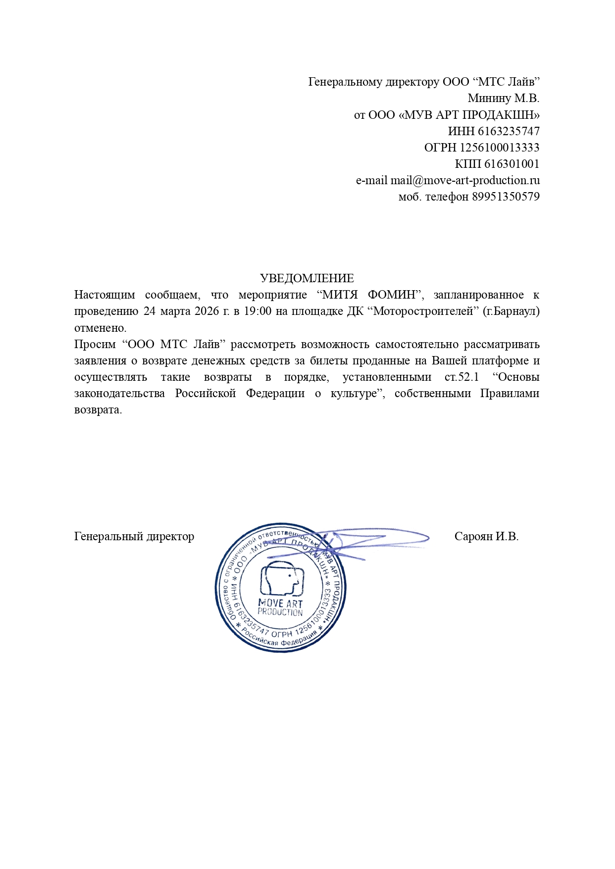 Уважаемый клиент! Спешим сообщить, что по информации, полученной от организатора, концерт Мити Фомина, запланированный на 24 марта 2026 года в 19:00, в ДК «Мотор», отменен. Деньги за электронные билеты вернутся автоматически в полном объёме на карту, с которой была произведена оплата. Если вы купили билет в кассе Ticketland.ru за наличный расчет, то обратитесь, пожалуйста, на почту: vozvrat@ticketland.ru. С уважением, команда поддержки Ticketland