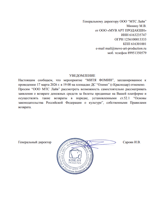 Уважаемый клиент! Спешим сообщить, что по информации, полученной от организатора, концерт Мити Фомина, запланированный на 17 марта 2026 года в 19:00 во Дворце спорта Олимп, отменён. Деньги за электронные билеты вернутся автоматически в полном объёме на карту, с которой была произведена оплата. Если вы купили билет в кассе Ticketland.ru за наличный расчет, то обратитесь, пожалуйста, на почту: vozvrat@ticketland.ru. С уважением, команда поддержки Ticketland.