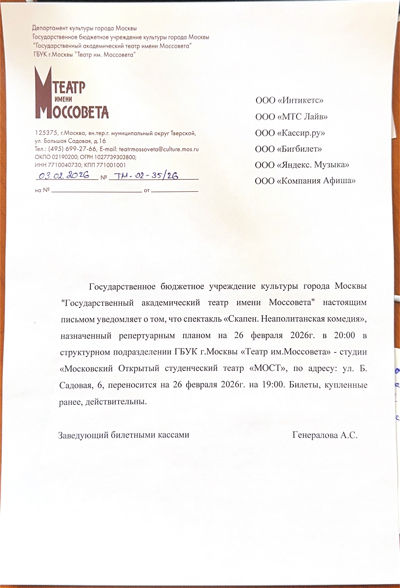 Уважаемый клиент! Спешим сообщить, что по информации, полученной от организатора, у спектакля «Скапен. Неаполитанская комедия», запланированного на 26 февраля 2026 года в 20:00, изменено время начала на час назад. Верное время начала спектакля в 19:00. Ранее приобретенные билеты действительны на новое время, обменивать их не нужно. С уважением, команда поддержки Ticketland.