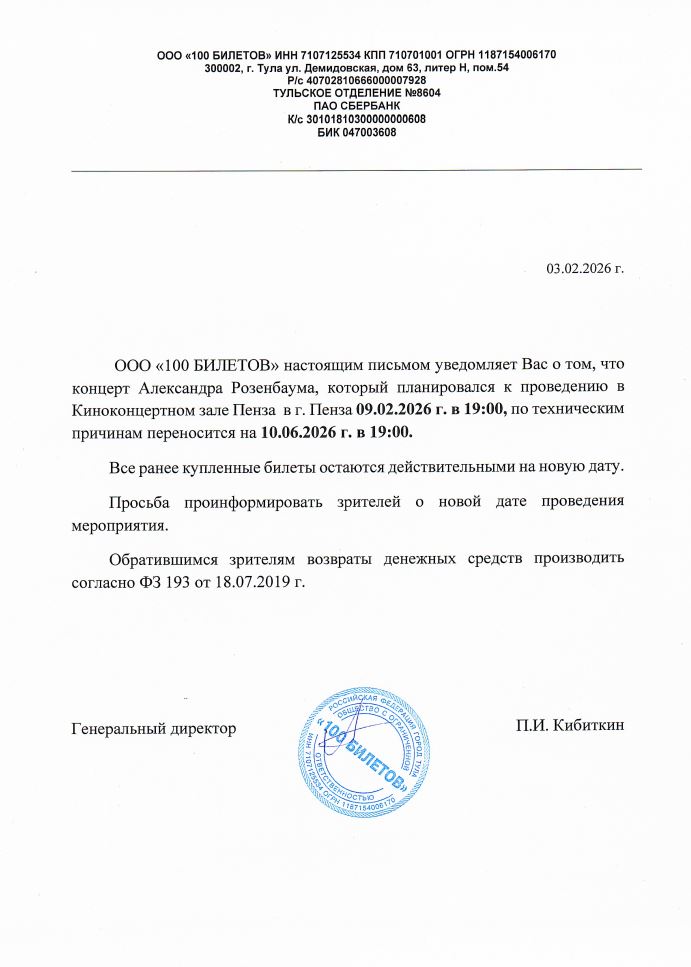 Уважаемый клиент! Спешим сообщить, что по информации, полученной от организатора, концерт Александра Розенбаума, запланированный на 9 февраля 2026 года в 19:00 в ККЗ «Пенза», перенесён на 10 июня 2026 года, начало в 19:00. Ранее приобретенные билеты действительны на новую дату, обменивать их не нужно. Если вам неудобно посетить балет в новую дату, вы можете вернуть билет по кнопке в личном кабинете во вкладке «Заказы». Деньги за электронные билеты вернутся автоматически в полном объёме на карту, с которой была произведена оплата. Если вы купили билет в кассе Ticketland.ru за наличный расчет, то обратитесь, пожалуйста, на почту: vozvrat@ticketland.ru. С уважением, команда поддержки Ticketland.