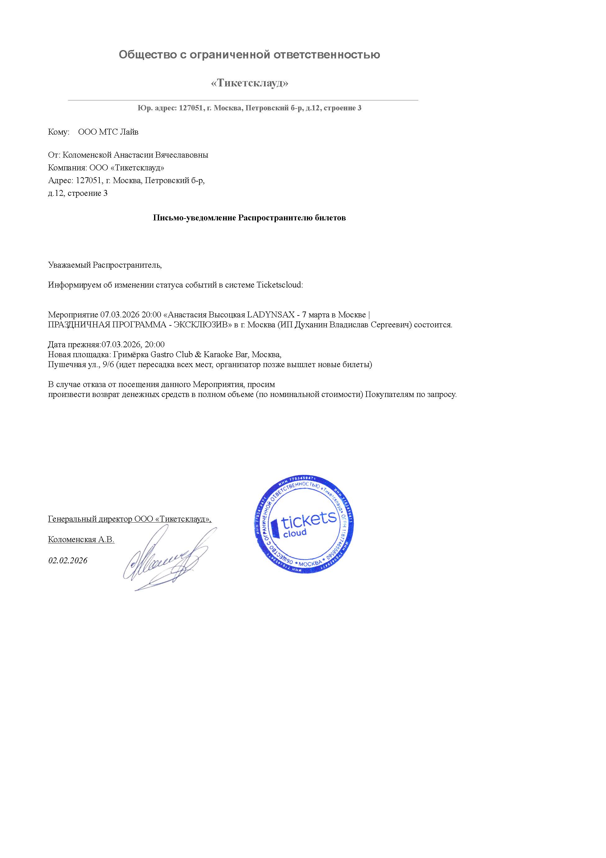 Уважаемый клиент! Спешим сообщить, что по информации, полученной от организатора, концерт Анастасии Высоцкой Ladynsax «Праздничная программа – эксклюзив», запланированный на 7 марта 2026 года в 20:00 в клубе «Life Pub», перенесён на другую площадку. Новое место проведения: Гримёрка Gastro Club & Karaoke Bar (г. Москва, ул. Пушечная, 9, корп. 6). Ранее приобретенные билеты недействительны (идет пересадка всех мест, организатор позже вышлет новые билеты). Если вам не удобно посетить мероприятие, вы можете вернуть билет по кнопке в личном кабинете во вкладке «Заказы» (до 07.03.26 20:00). Деньги за электронные билеты вернутся автоматически в полном объёме на карту, с которой была произведена оплата. Если вы купили билет в кассе Ticketland.ru за наличный расчет, то обратитесь, пожалуйста, на почту: vozvrat@ticketland.ru. С уважением, команда поддержки Ticketland