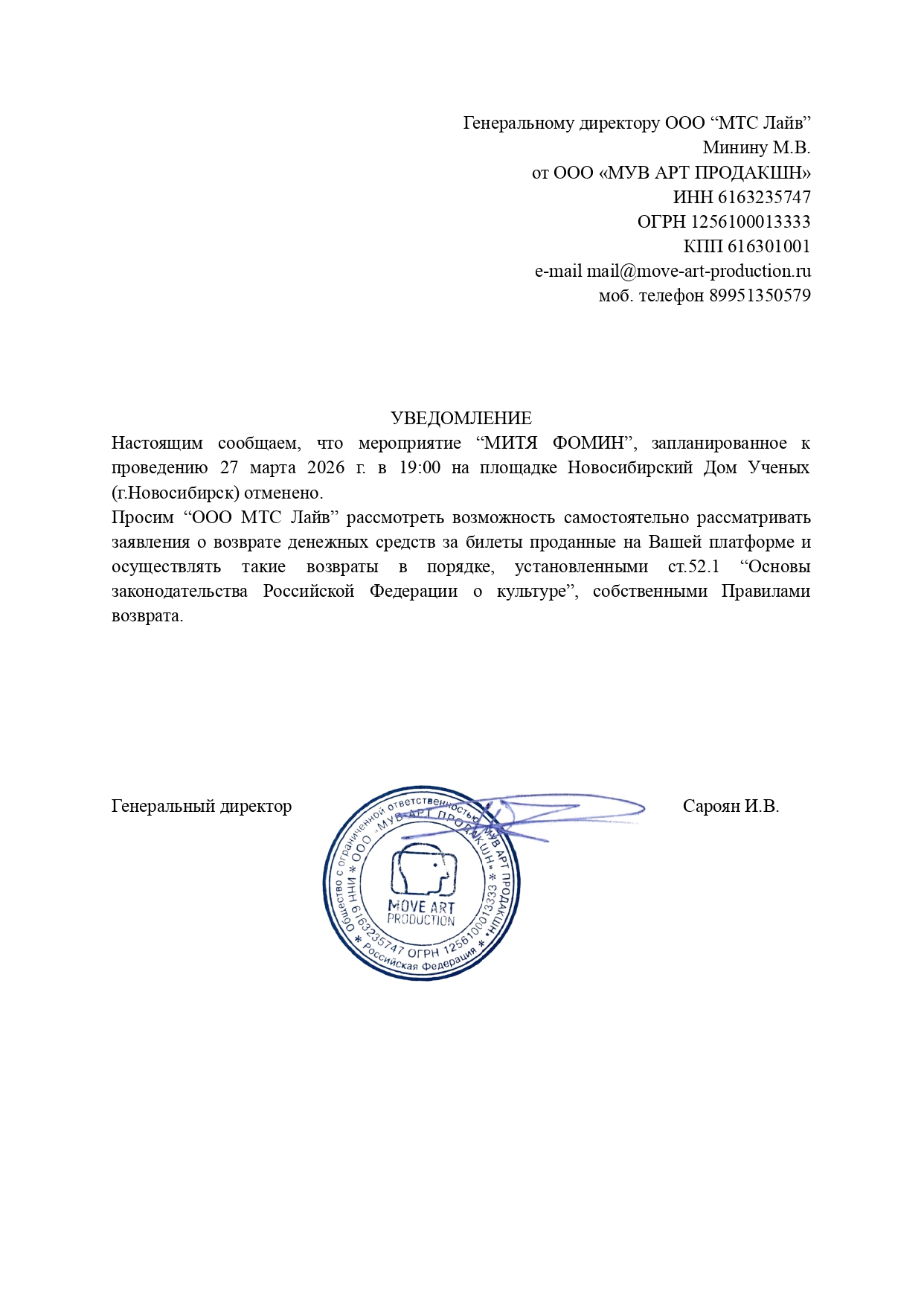 Уважаемый клиент! Спешим сообщить, что по информации, полученной от организатора, концерт Мити Фомина, запланированный на 27 марта 2026 года в 19:00, в Новосибирском доме ученых, отменен. Деньги за электронные билеты вернутся автоматически в полном объёме на карту, с которой была произведена оплата. Если вы купили билет в кассе Ticketland.ru за наличный расчет, то обратитесь, пожалуйста, на почту: vozvrat@ticketland.ru. С уважением, команда поддержки Ticketland