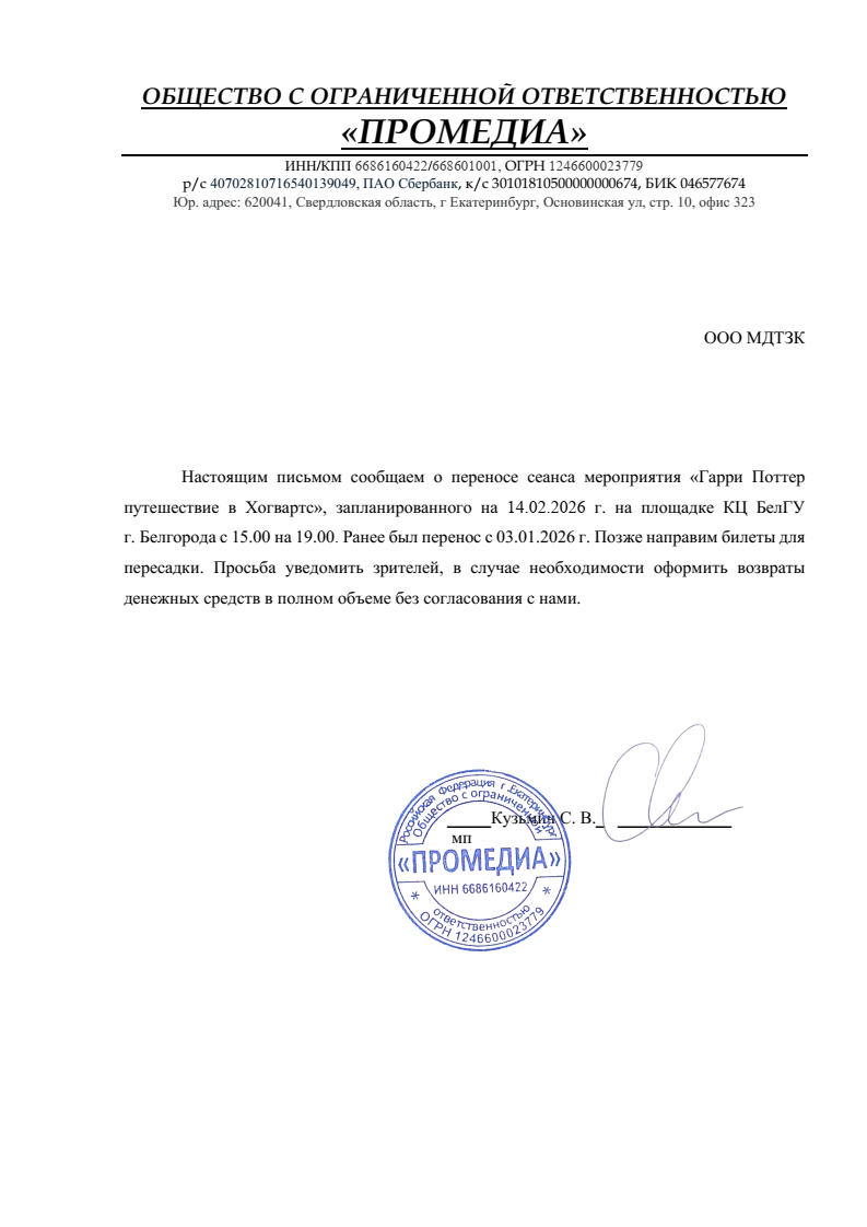 Уважаемый клиент! Спешим сообщить, что по информации, полученной от организатора, концерт «Гарри Поттер: Путешествие в Хогвартс», запланированный на 14 февраля 2026 года в 15:00 в МКЦ БЕЛГУ, перенесен на 19:00. Новые билеты будут высланы вам позднее. Если вам не удобно посетить мероприятие в новое время, вы можете вернуть билет по кнопке в личном кабинете во вкладке «Заказы». Деньги за электронные билеты вернутся автоматически в полном объёме на карту, с которой была произведена оплата. Если вы купили билет в кассе Ticketland.ru за наличный расчет, то обратитесь, пожалуйста, на почту: vozvrat@ticketland.ru. Письмо от организатораС уважением, команда поддержки Ticketland.