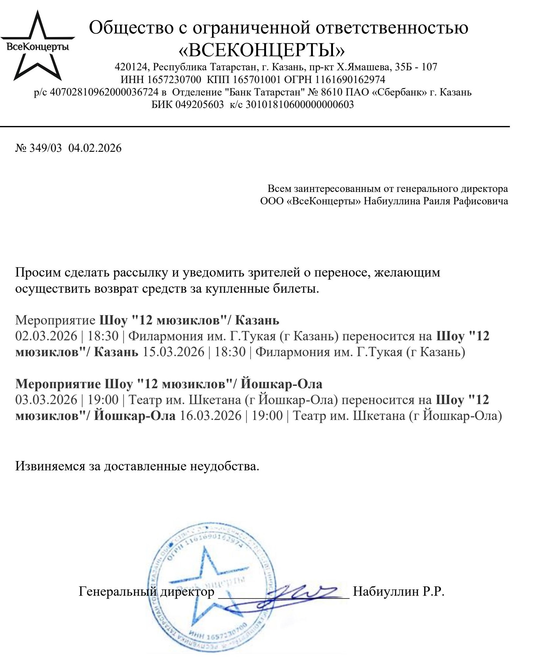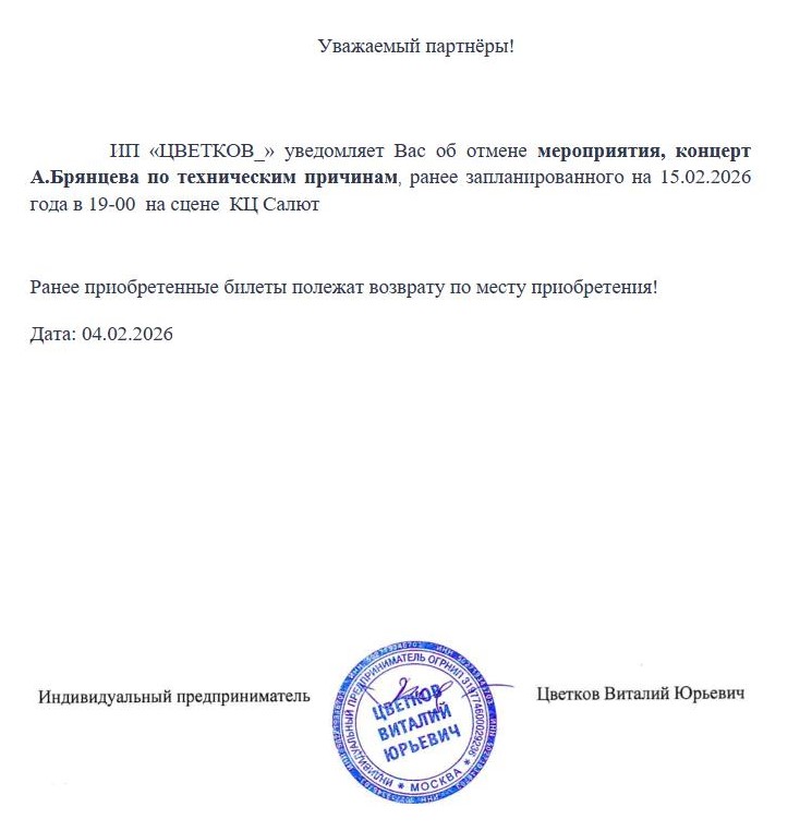 Уважаемый клиент! Спешим сообщить, что по информации, полученной от организатора, сольный концерт Ислама Итляшева с программой - ОНА ЛЮБИЛА РОЗЫ», запланированный на 20 февраля 2025 года в Липецк КРК Мегаполис, перенесен на открытую дату в связи с болезнью артиста.. Новая дата будет объявлена дополнительно. Ранее приобретенные билеты действительны на новую дату, обменивать их не нужно. Если вам не удобно посетить мероприятие в новую дату, вы можете вернуть билет по кнопке в личном кабинете во вкладке «Заказы». Деньги за электронные билеты вернутся автоматически в полном объёме на карту, с которой была произведена оплата. Если вы купили билет в кассе Ticketland.ru за наличный расчет, то обратитесь, пожалуйста, на почту: vozvrat@ticketland.ru. С уважением, команда поддержки Ticketland.