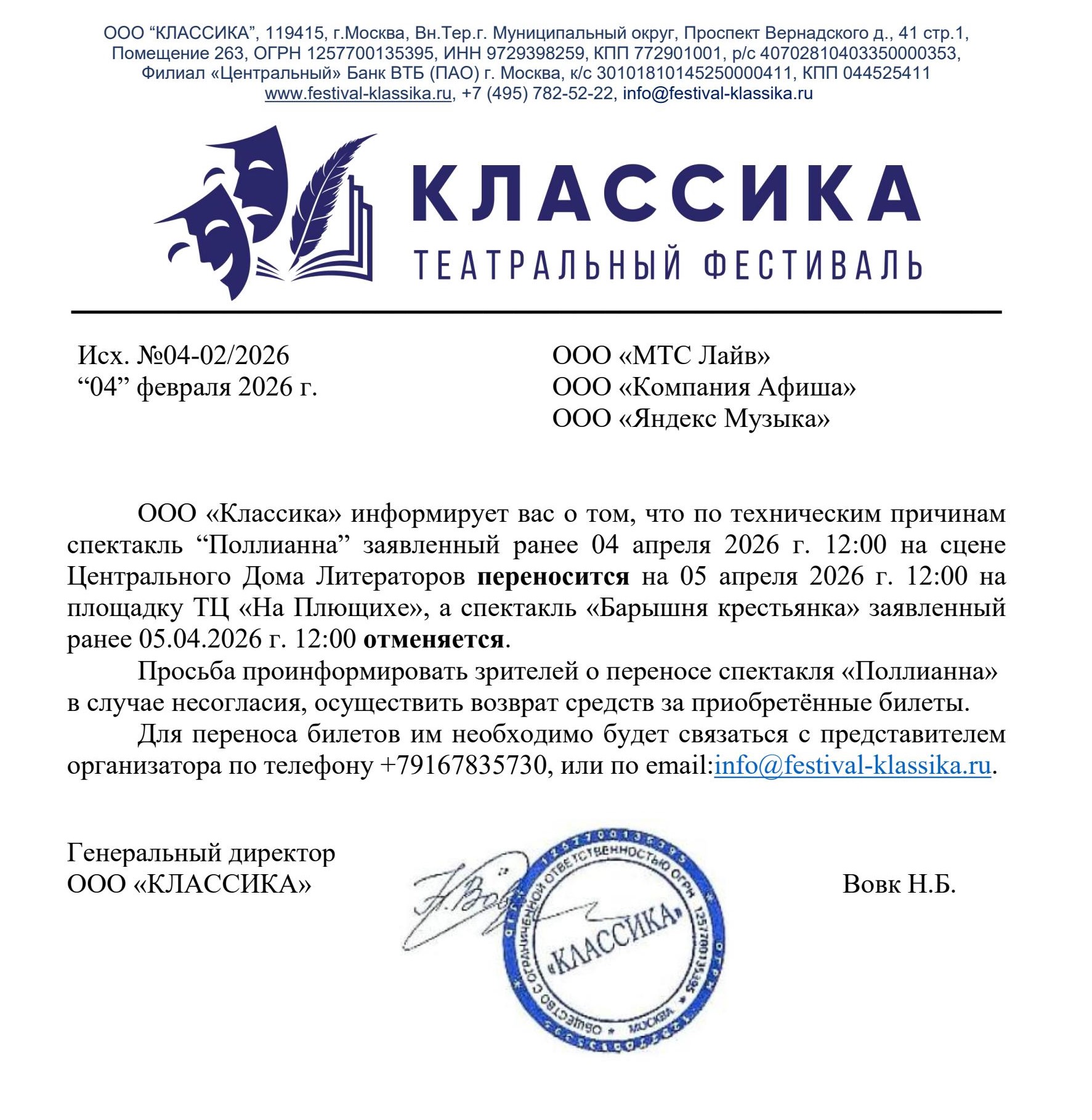 Уважаемый клиент! Спешим сообщить, что по информации, полученной от организатора, спектакль «Фальшивая нота», запланированный на 5 января 2025 года в 18:00 в Театре имени Ленсовета, заменён на спектакль «Синьор из высшего общества». Ранее приобретенные билеты действительны на новый спектакль, обменивать их не нужно. Если новый спектакль вам не подходит, вы можете вернуть билет по кнопке в личном кабинете во вкладке «Заказы». Деньги за электронные билеты вернутся автоматически в полном объёме на карту, с которой была произведена оплата. Если вы купили билет в кассе Ticketland.ru за наличный расчет, то обратитесь, пожалуйста, на почту: vozvrat@ticketland.ru. С уважением, команда поддержки Ticketland.