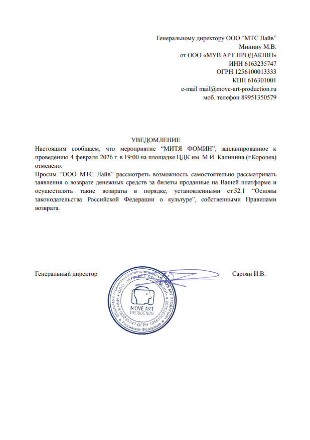 Уважаемый клиент! Спешим сообщить, что по информации, полученной от организатора, концерт Мити Фомина, запланированный на 6 февраля 2026 года в 19:00 в КЦ Зеленоград, отменён. Деньги за электронные билеты вернутся автоматически в полном объёме на карту, с которой была произведена оплата. Если вы купили билет в кассе Ticketland.ru за наличный расчет, то обратитесь, пожалуйста, на почту: vozvrat@ticketland.ru. С уважением, команда поддержки Ticketland.