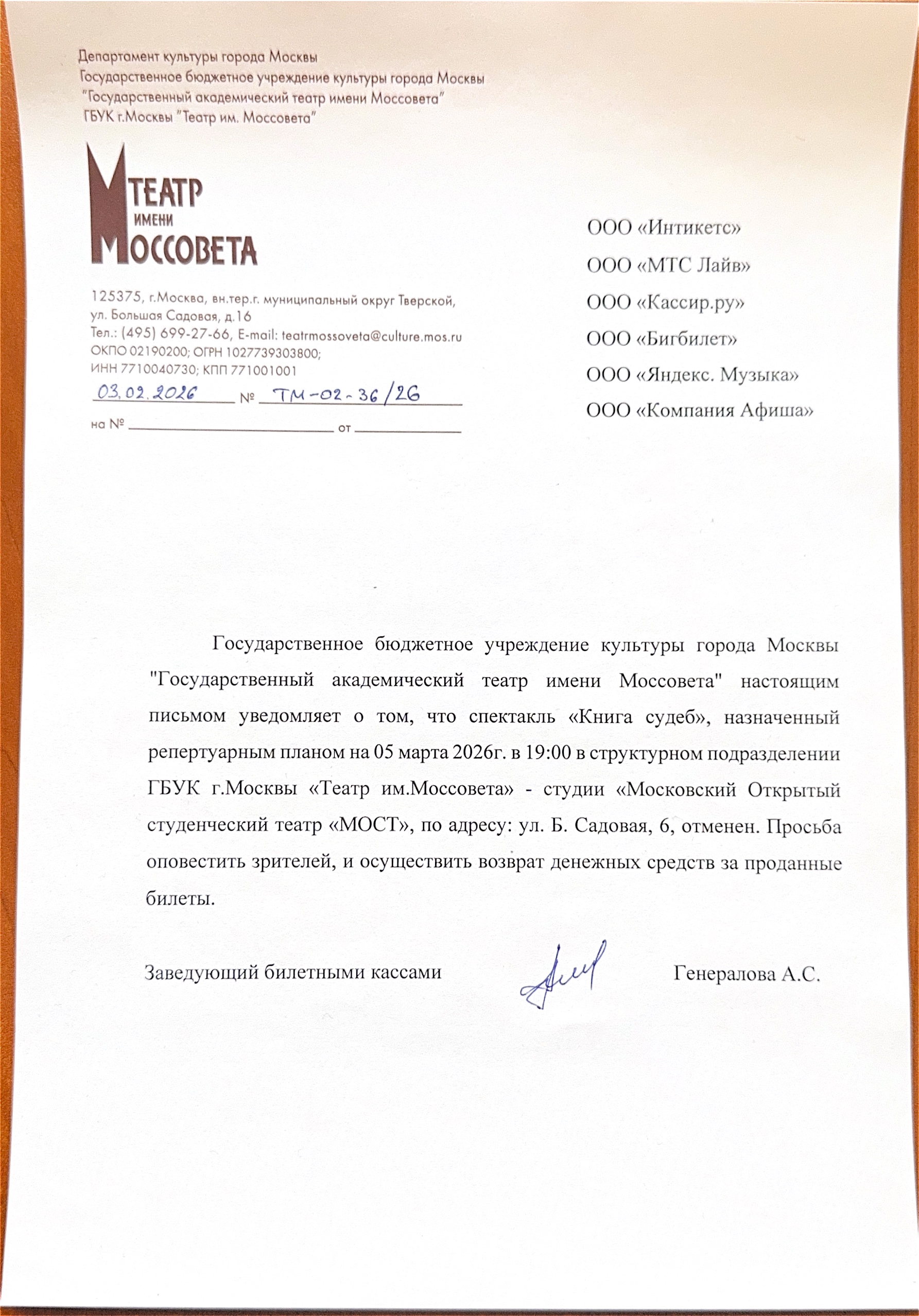 Уважаемый клиент! Спешим сообщить, что по информации, полученной от организатора, спектакль «Книга судеб», запланированный на 5 марта 2026 года в 19:00 в театре «МОСТ» (Основная сцена), отменён. Деньги за электронные билеты вернутся автоматически в полном объёме на карту, с которой была произведена оплата. Если вы купили билет в кассе Ticketland.ru за наличный расчет, то обратитесь, пожалуйста, на почту: vozvrat@ticketland.ru. С уважением, команда поддержки Ticketland.