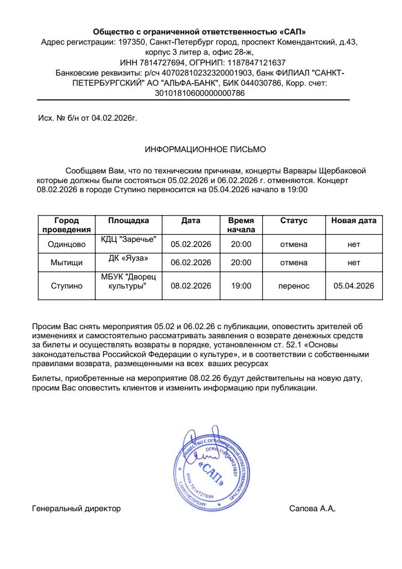 Уважаемый клиент! Спешим сообщить, что по информации, полученной от организатора, концерт группы «Ленинград», запланированный на 31 января 2026 года в 19:00 в СКК «Дворец Спорта имени Владимира Высоцкого», перенесен на 7 февраля 2026 года, начало в 19:00. Ранее приобретенные билеты действительны на новую дату, обменивать их не нужно. Письмо от организатораС уважением, команда поддержки Ticketland