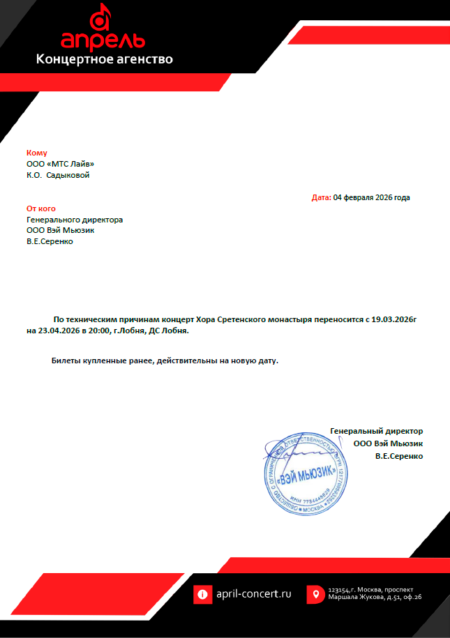 Уважаемый клиент! Спешим сообщить, что по информации, полученной от организатора, юбилейный концерт к 30-летию хора Сретенского монастыря, запланированный на 19 марта 2026 года в 19:00 во дворце спорта «Лобня», перенесён на 23 апреля 2026 года, начало в 20:00. Ранее приобретенные билеты действительны на новую дату, обменивать их не нужно. Если вам не удобно посетить мероприятие в новую дату, вы можете вернуть билет по кнопке в личном кабинете во вкладке «Заказы». Деньги за электронные билеты вернутся автоматически в полном объёме на карту, с которой была произведена оплата. Если вы купили билет в кассе Ticketland.ru за наличный расчет, то обратитесь, пожалуйста, на почту: vozvrat@ticketland.ru. С уважением, команда поддержки Ticketland
