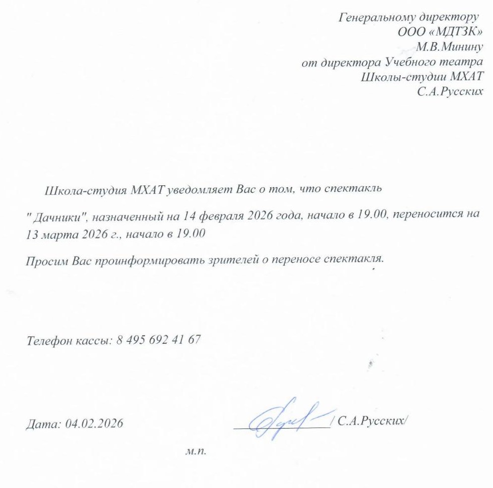 Уважаемый клиент! Спешим сообщить, что по информации, полученной от организатора, спектакль «Дачники», запланированный на 14 февраля 2026 года в 19:00 в Учебном театре Школы-студии МХАТ, перенесён на 13 марта 2026 года, начало в 19:00. Ранее приобретенные билеты действительны на новую дату, обменивать их не нужно. Если вам не удобно посетить спектакль в новую дату, вы можете вернуть билет по кнопке в личном кабинете во вкладке «Заказы». Деньги за электронные билеты вернутся автоматически в полном объёме на карту, с которой была произведена оплата. Если вы купили билет в кассе Ticketland.ru за наличный расчет, то обратитесь, пожалуйста, на почту: vozvrat@ticketland.ru. С уважением, команда поддержки Ticketland.