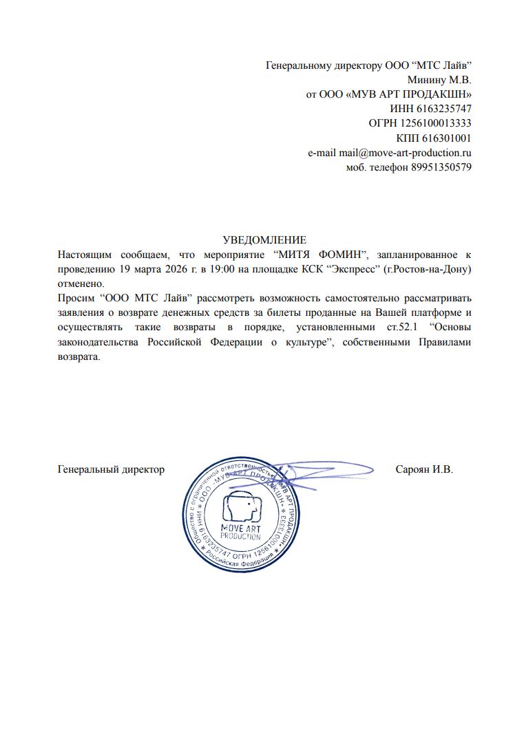 Уважаемый клиент! Спешим сообщить, что по информации, полученной от организатора, концерт Мити Фомина, запланированный на 19 марта 2026 года в 19:00 в КСК «Экспресс», отменен. Деньги за электронные билеты вернутся автоматически в полном объёме на карту, с которой была произведена оплата. Если вы купили билет в кассе Ticketland.ru за наличный расчет, то обратитесь, пожалуйста, на почту: vozvrat@ticketland.ru. С уважением, команда поддержки Ticketland