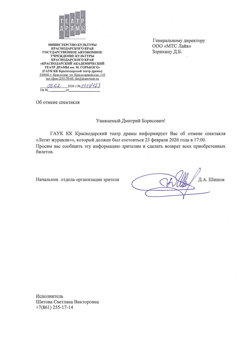 Уважаемый клиент! Спешим сообщить, что по информации, полученной от организатора, спектакль «Летят журавли», запланированный на 23 февраля 2026 года в 17:00 в театре драмы им. Горького, отменён. Деньги за электронные билеты вернутся автоматически в полном объёме на карту, с которой была произведена оплата. Если вы купили билет в кассе Ticketland.ru за наличный расчет, то обратитесь, пожалуйста, на почту: vozvrat@ticketland.ru. Письмо от организатораС уважением, команда поддержки Ticketland.
